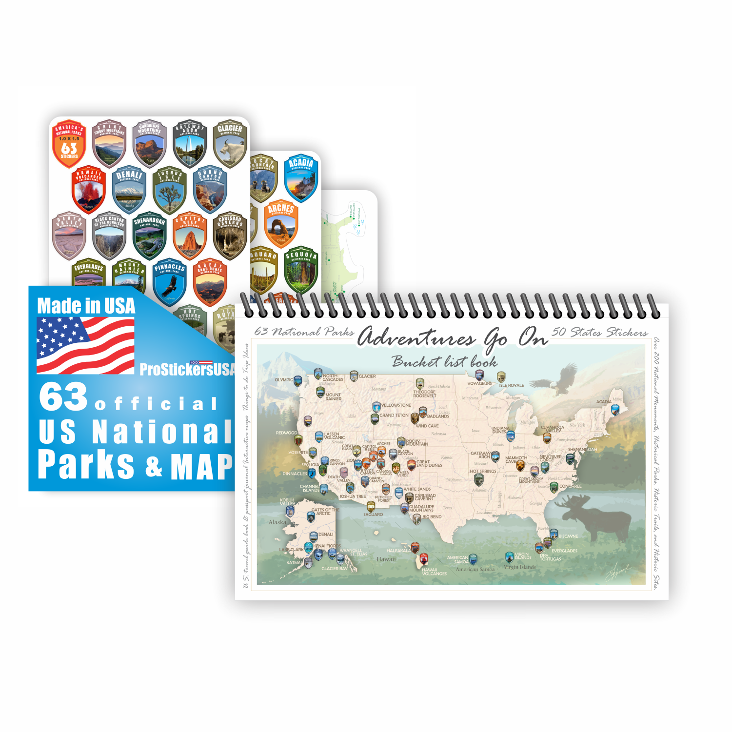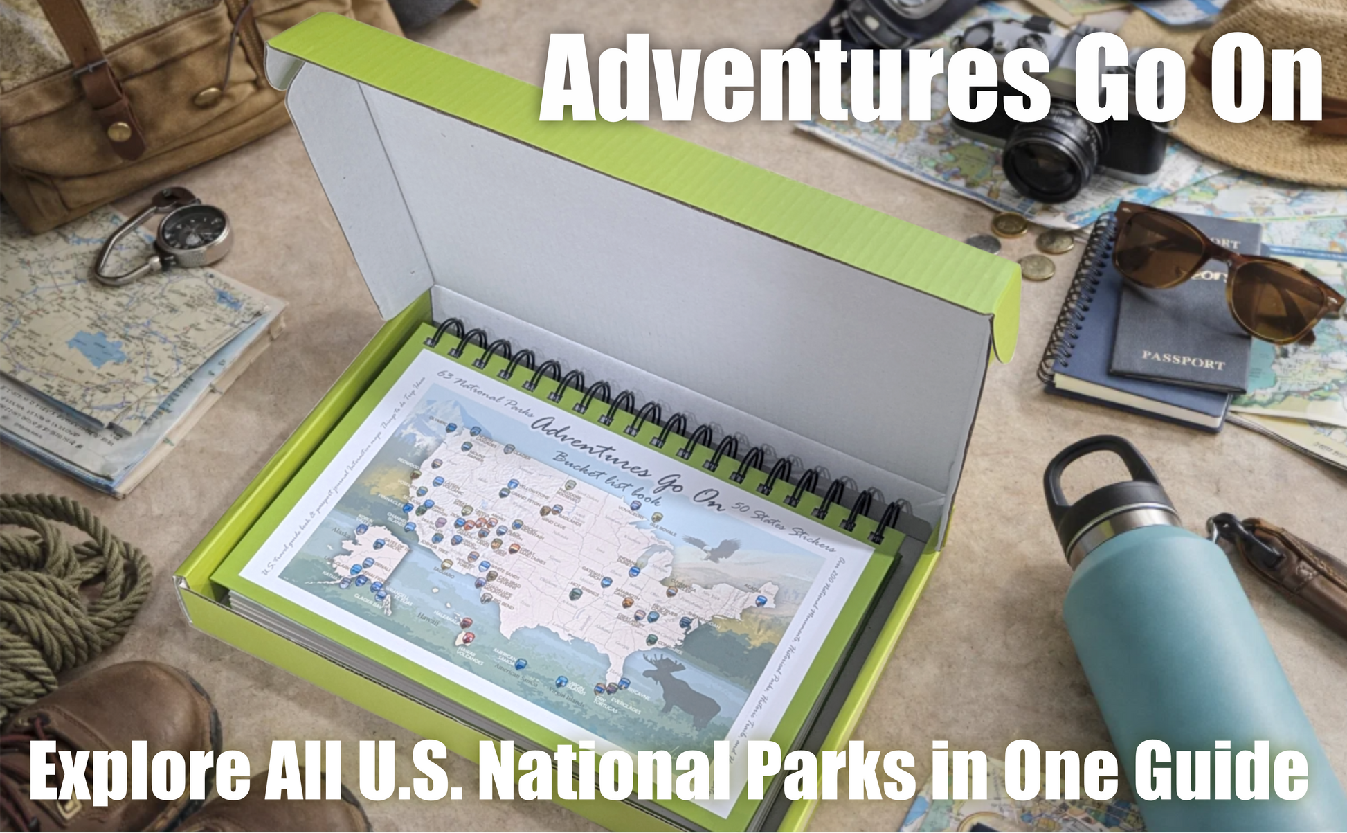 BOOK and STICKERS. The book is a guide to the national parks of the United States of America with complete stickers for all 63 US national parks. A book for experienced and beginners on their way of knowing tourists and travelers. A brief description of all of the national parks in the USA. Bucket list book, campground, do & trip ideas, and hiking lists of this book. Adventures Go On.